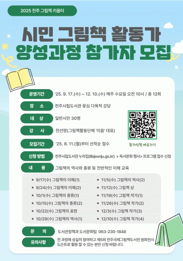 이번 교육과정은 그림책의 역사와 종류 등 전반적인 그림책 기본 교육으로 구성되며, 그림책 활동단체인 ‘이음’의 전선영 대표가 진행을 맡는다. 참여를 원하는 시민은 전주시 도서관 누리집(lib.jeonju.go.kr)을 통해 선착순 30명까지 접수할 수 있다.