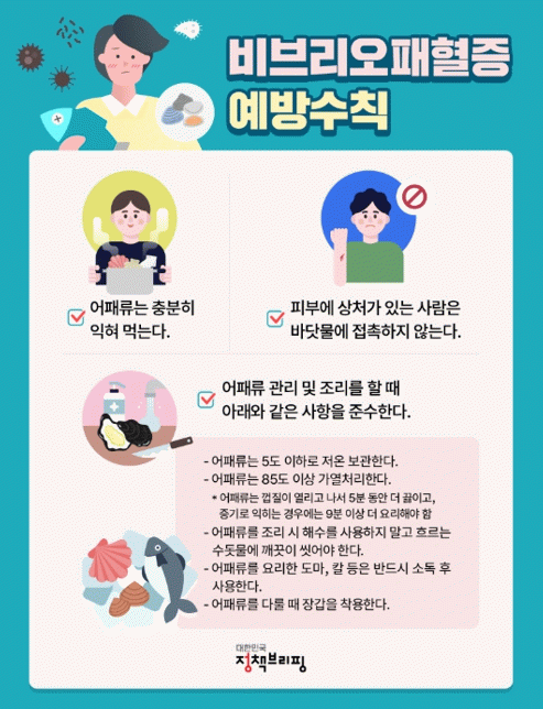 또한 어패류 손질 시 장갑을 착용하고 조리도구는 흐르는 물에 깨끗이 씻어 사용할 것을 강조했고 만성 간질환자, 당뇨환자 등 고위험군은 어패류 생식 절대 금지 등을 당부했다.