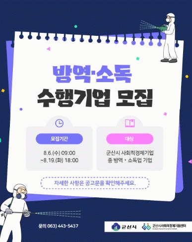 군산시 이헌현 일자리경제과장은 “이번 사업은 사회적경제 기업이 더욱 안전하고 위생적인 환경에서 활동할 수 있도록 돕고 동시에, 방역·소독 전문성을 갖춘 사회적경제 기업에 실질적인 일감을 제공하는 사업이다.”라고 강조했다.