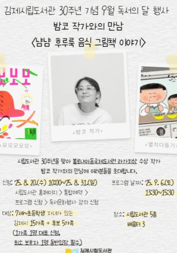이번 작가와의 만남은 밤코 작가를 초청 “냠냠 후루룩 음식 그림책 이야기”라는 주제로 “모모모모모”, “멸치다듬기” 책을 주제도서로 그림책 속 이야기와 창작 비하인드를 직접 들을 수 있는 소중한 기회가 될 것으로 기대된다.