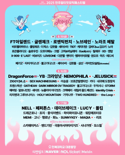 또한 같은 날 밤 JUMF와 전주세계소리축제와 함께하는 ‘소리업 점프 나이트(SORI UP! JUMF NIGHT)’가 남부시장 모이장에서 △페기굿 △삼산 △김뜻돌 등의 무대와 함께 페스티벌의 열기를 새벽까지 이어가게 된다.