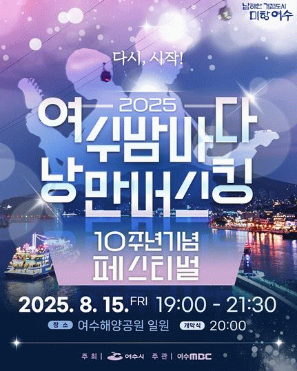 15일에는 해양공원 일대에서 ‘2025 여수밤바다 낭만버스킹 페스티벌’이, 16일에는 웅천친수공원과 예술의 섬 장도에서 ‘2025 대한민국 밤밤페스타’가 열린다.