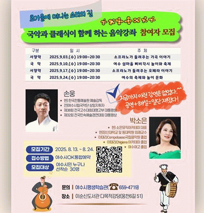 강사진은 손웅 한국전통예술원 예술감독(전 여수시립국악단 상임지휘자)과 여수 출신 소프라노 박소은(소은뮤직아카데미 대표)이며, 무대 경험과 전문성을 바탕으로 강의를 진행할 예정이다.