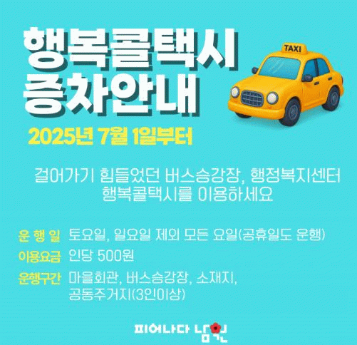 행복콜택시는 평일 8시부터 18시까지 운행하며, 면민들은 누구나 요금 500원만 지불하면 정해진 구간 내에서 자유롭게 이동할 수 있다.