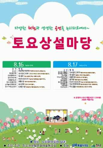장수군이 후원하고 생문동이 주관하는 이번 ‘토요상설마당’은 장수 지역 주민들이 일상 속에서 문화예술을 쉽고 친근하게 접하고 즐길 수 있도록 기획된 행사로 지역 주민의 문화 나눔을 실현할 수 있도록 다채로운 공연과 전시·체험으로 이루어질 예정이다.