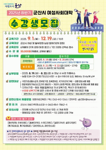 채은영 여성가족청소년과장은 “시민들의 수요를 반영한 다양한 강좌를 준비했다”며, “앞으로도 질 높은 강좌를 발굴해 시민 만족도를 높여 나가겠다”고 밝혔다.