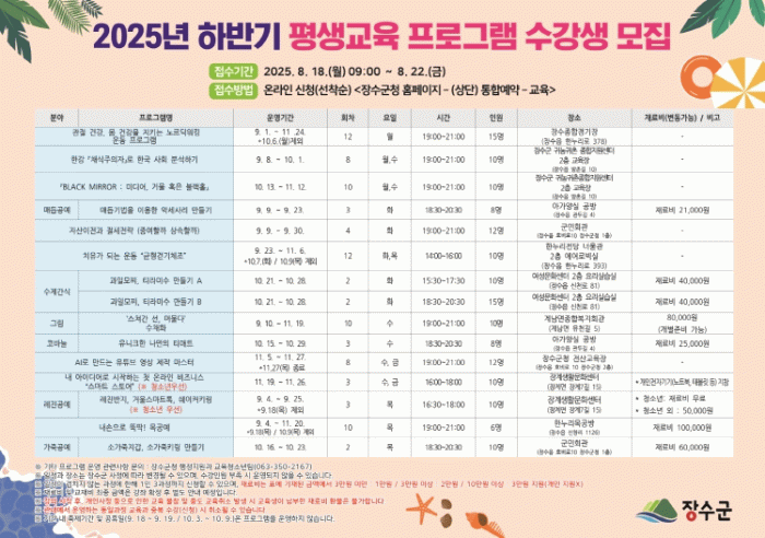 모든 강좌는 장수군민회관, 장수군귀농귀촌종합지원센터, 장계생활문화센터, 계남면종합복지회관 등 10개소에서 운영되며 장수군에 주소를 둔 군민이라면 누구나 신청가능하다.