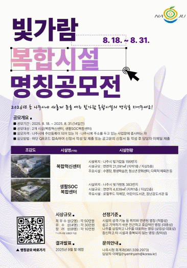명칭 공모와 관련한 문의 사항은 나주시 회계과 복합시설운영TF팀으로 하면 된다.