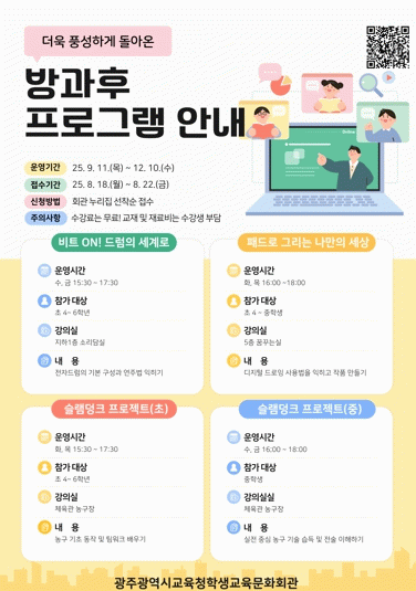 정은남 광주학생교육문화회관장은 “올해 신설된 디지털 드로잉 강좌를 비롯해 다양한 프로그램을 통해 학생들이 재능과 흥미를 발견하고, 협동심과 창의성을 키울 수 있도록 적극 지원하겠다”며 “앞으로도 학생들의 전인적 성장을 돕는 교육문화 환경이 조성되도록 최선을 다하겠다”고 말했다.