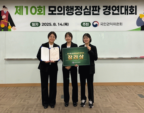 지난 8월 14일 정부세종청사에서 열린 이번 대회에서 법전원 이유지, 이수현, 정영운(이상 16기) 학생으로 구성된 ‘행심하세요’팀(지도교수 신태섭)은 역대 최다인 43개 팀이 참가한 예선을 통과해 본선에 진출했으며, 8개 본선 진출팀 가운데 당당히 장려상을 차지했다.