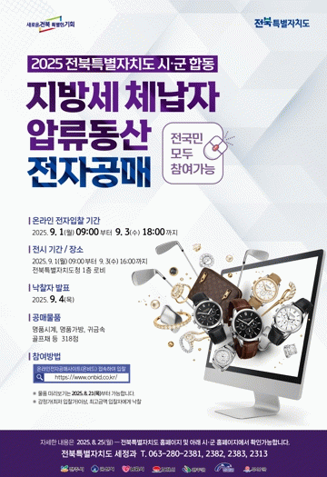 이번 공매는 전북특별자치도와 도내 7개 시·군이 합동으로 진행하며, 9월 1일부터 3일까지 전북특별자치도청 1층 로비에서 물품 전시가 이루어질 예정이다. 현장에서는 공매 물품을 확인 가능하고, 입찰은 한국자산관리공사에서 관리하는 온비드를 통해 전 국민이 입찰 가능하다. 낙찰자는 최고가 입찰자가 되며, 낙찰 결과는 9월 4일에 발표된다.