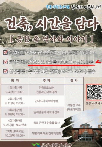 도서관 관계자는 “목포 건축의 가치와 이야기를 시민과 함께 탐구함으로써 도서관이 지식과 문화의 거점으로서 역할을 강화하고자 한다”며 “특히 고령층의 학습 욕구 충족과 지역사회 문화유산 보존 의식 확산에도 기여할 것”이라고 밝혔다.