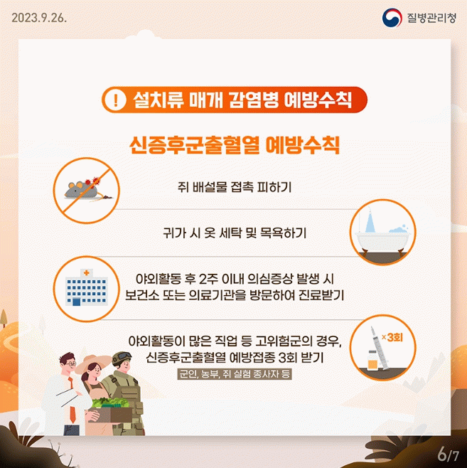 신증후군출혈열은 설치류에 감염된 바이러스가 사람에게 전파되는 급성 발열성 감염병으로, 쥐의 배설물이 건조되어 공기 중에 퍼진 바이러스를 들이마시거나 장화나 장갑 없이 야외에서 작업하다가 상처 난 피부에 접촉 시 감염될 수 있다.