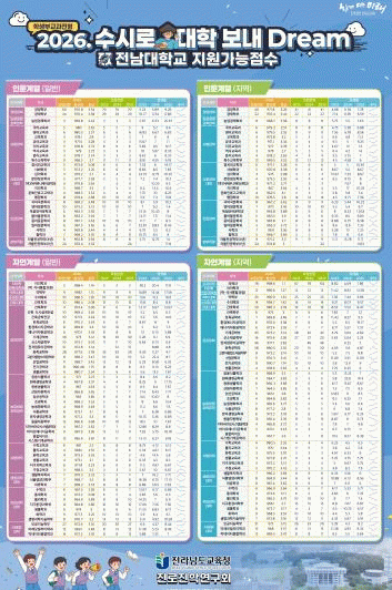 ‘2026. 대입일정 정리해 DREAM’은 원서 접수, 합격자 발표, 대학별 전형 일정 등 주요 대입 일정을 한눈에 볼 수 있도록 정리한 것이며, ‘2026학년도 수시로 대학 보내 DREAM’은 서울 주요 대학, 의약학계열, 전남대 교과전형의 합격 가능 등급 및 교과 환산 점수를 예측한 자료이다.