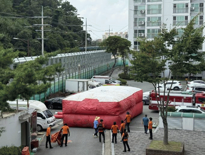 훈련 내용은 △공기안전매트 전개 및 기능 점검 △인명구조 대응방안 토의 △작동원리와 주의사항 숙지 △공동주택 관계자 대상 관리 요령 교육 등으로 진행됐다. 이번 아파트 훈련에 사용된 공기안전매트는 최대 10층 높이에서도 비상탈출이 가능하며 전개시간은 약 2분가량 소요됐다.