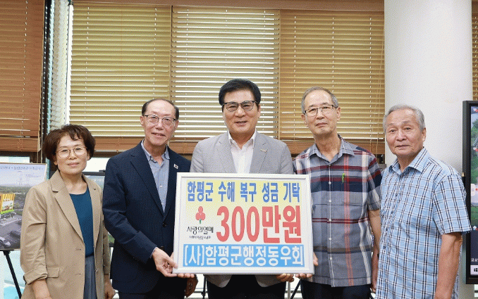 함평군은 19일 “(사)함평군행정동우회가 전날 집중호우 피해지역의 조속한 복구와 군민 생활 안정을 위해 회원들이 직접 모금한 성금 300만 원을 기탁했다”고 밝혔다.