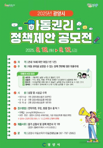 박정금 광양시 아동보육과장은 “이번 공모전은 아동이 일상에서 체감하는 권리를 직접 표현할 수 있는 소중한 기회”라며, “앞으로도 아동의 목소리에 귀 기울이고, 아동이 존중받는 아동친화도시 조성을 위해 지속적으로 노력하겠다”고 밝혔다.