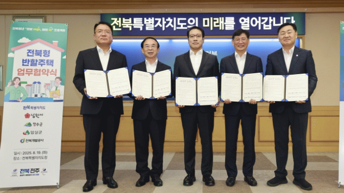 도는 19일 도청에서 남원시·장수군·임실군 및 전북개발공사와 '전북형 반할주택' 1단계 사업의 성공적 추진을 위한 업무협약을 체결했다. 이날 협약식에는 김관영 도지사를 비롯해 최경식 남원시장, 최훈식 장수군수, 심민 임실군수, 김대근 전북개발공사 사장이 참석했다.