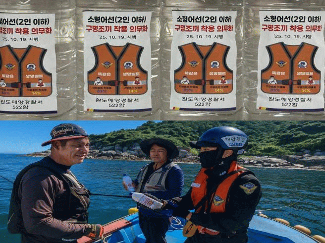 이에 완도해경 522함은 얼음 생수병에 위 개정안의 내용이 담긴 스티커를 부착해 조업 중인 어민들에게 나눠줌으로써 구명조끼 착용의 중요성과 개정 법령의 주요 내용을 자연스럽게 전달했다.