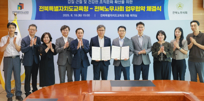 협약식에는 유정기 교육감 권한대행, 이홍열 감사관, 전북노무사회 신용순 회장, 황석민 노무사 등 양 기관 관계자 10여 명이 참석해 건강한 조직문화 확산 기반 마련에 적극 협력을 약속했다.