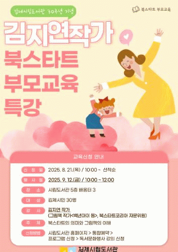 이번 부모교육 특강은 영유아 독서 환경 조성을 위한 북스타트 프로그램 일환으로 마련됐으며, 김지연 작가는 ‘백년아이’ 등 다수의 그림책을 집필하고 북스타트 코리아 자문위원으로 현재 활동 중이다.