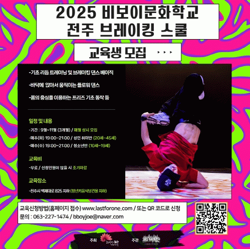 전주시와 비보이 전문예술법인인 (사)라스트포원은 오는 9월부터 11월까지 운영되는 하반기 전주브레이킹스쿨에 참여할 수강생을 선착순 모집한다고 20일 밝혔다.