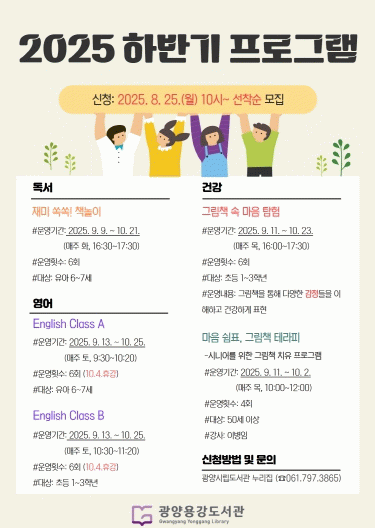 이번 하반기 프로그램은 ▲그림책 속 마음 탐험 ▲마음 쉼표, 그림책 테라피 ▲재미 쏙쏙! 책놀이 ▲English Class A(6~7세) ▲English Class B(초등 1~3학년) 총 5개 강좌로, 오는 9월 9일부터 10월 25일까지 운영된다.