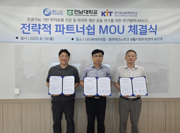 전남대 수의과대학(학장 박상익)은 지난 18일 ㈜에이아이랩(대표 정기봉), 국가독성과학연구소 전북첨단바이오연구본부(본부장 김성환)과 ㈜에이아이랩(광주테크노파크)에서 '반려동물 건강 및 삶의 질 개선을 위한 연구개발 협약(MOU)'을 체결했다.