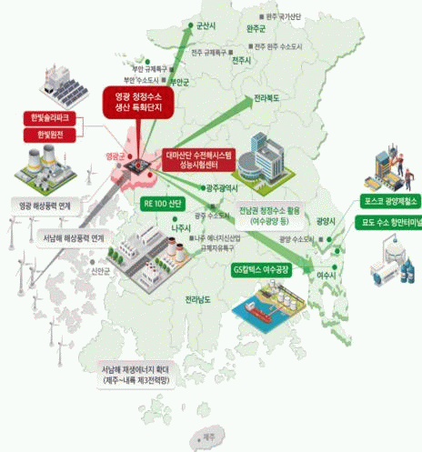 전남도는 영광 대마산단 배후부지(2만 5천 평)와 대마산단(7만 평)에 총사업비 2조 7천억 원 규모의 국내 최대 수소특화단지를 조성하고, 1단계로 500MW급 청정수소 생산시설 구축 후 향후 1GW까지 확장할 계획이다.