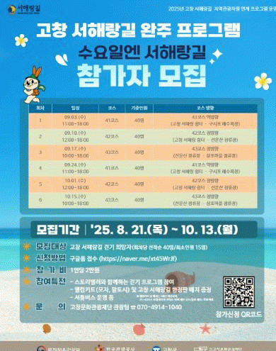 ‘수요일엔 서해랑길’은 고창 서해랑길의 대표 코스를 매주 한 구간씩 완주하는 정기 프로그램으로, 회차별 선착순 40명을 모집해 9월 3일부터 10월 15일까지 총 6회에 걸쳐 진행된다.