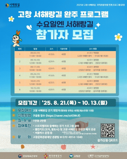‘수요일엔 서해랑길’은 고창 서해랑길의 대표 코스를 매주 한 구간씩 완주하는 정기 프로그램으로, 회차별 선착순 40명을 모집해 9월 3일부터 10월 15일까지 총 6회에 걸쳐 진행된다. 참가비는 1인 2만 원이며, 신청은 네이버폼을 통해 상시 접수한다.