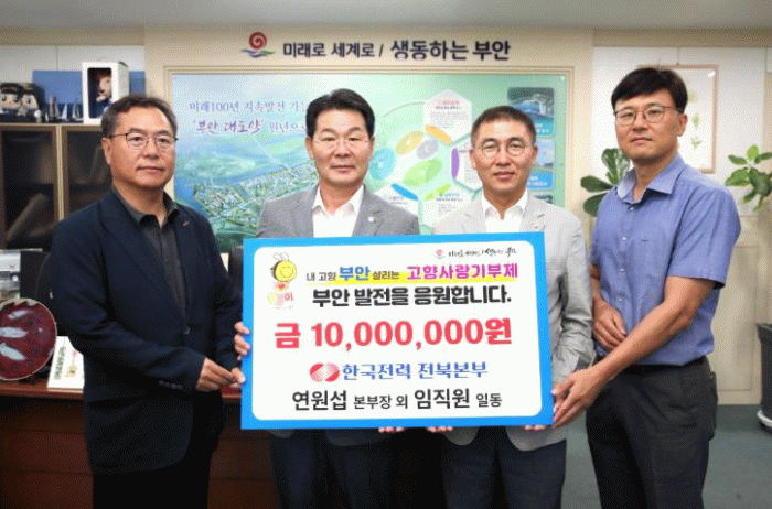 이번 기부는 지역사회와의 상생을 강조해온 한전 전북본부가 지역균형발전과 주민복지 증진에 기여하기 위해 자발적으로 참여한 것으로, 임직원들이 한마음으로 모은 정성이 부안군에 큰 힘이 될 것으로 기대된다.