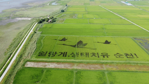 단지에서는 매년 일반벼와 유색벼를 활용해 흑두루미 그림과 문구를 새겨 넣으며 친환경 경관농업을 실천하고 있다. 올해는 ‘쉴랑게, 생태치유 순천!’이라는 문구와 흑두루미 가족이 자유롭게 나는 모습을 형상화해, 원시적인 순천만 대자연 속에서 자연과 공존을 통해 치유도시로 도약하고 있는 순천의 정체성을 알리고 있다.