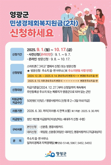 이번 2차분은 지난 1차와 동일한 기준으로 지급기준일인 2024년 12월 27일부터 신청일까지 계속해서 영광군에 주소를 둔 군민을 대상으로 하며, 지급기준일 이후 발생한 사망자, 전출자, 거주불명등록자, 말소자 등은 지급 제외대상이며 전액 ‘영광사랑카드’로 지급할 계획이다.