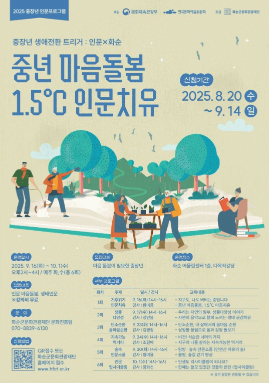 첫 번째 프로그램은 ‘중년 마음돌봄 1.5℃ 인문치유’로 8월 20일부터 9월 14일까지 참여자를 모집한다.