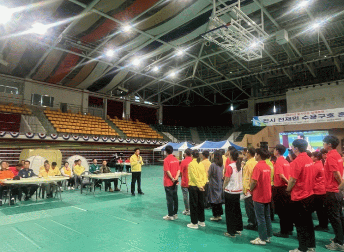 지난 20일에는 금산군종합체육관에서 실제 훈련으로 전재민 수용 구호 훈련을 시행했다.