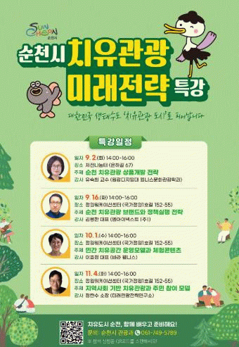 '순천시 치유관광 미래전략 특강'은 학계·산업계·민간을 대표하는 전문가 4인이 참여해 상품 개발, 브랜드 전략, 민간 협력, 주민 참여 모델 등 치유관광의 전 과정을 아우르는 청사진을 제시한다.