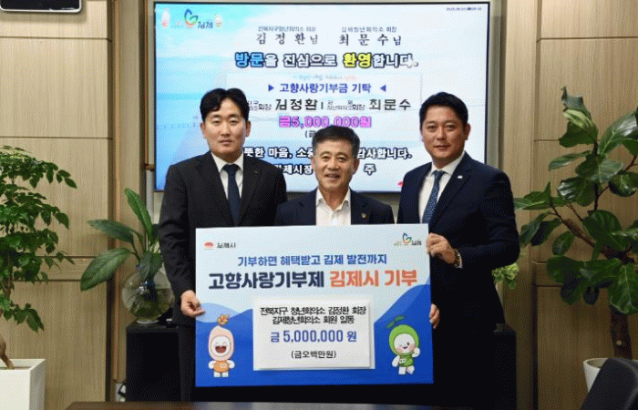 정성주 김제시장은 “첫 지정기부사업의 성공적인 시행을 위해 고향사랑기부를 해주신 김정환 회장과 최문수 회장에 감사를 표한다”며 “꼭 필요한 사업인 만큼 모금 목표액을 달성할 수 있도록 최선의 노력을 기울이겠다.”고 말했다.