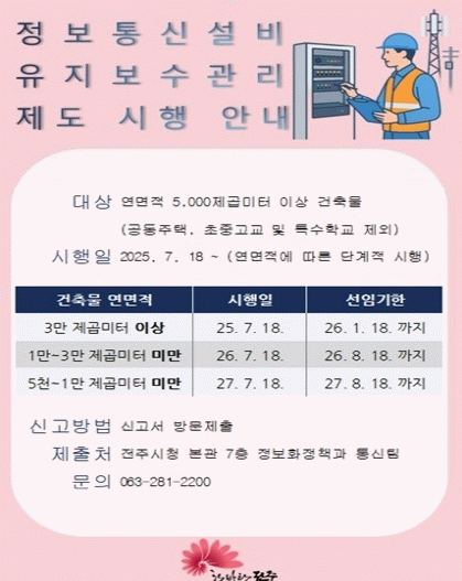 전아미 전주시 정보화정책과장은 “정보통신설비는 시민 안전과 직결되는 핵심 기반시설”이라며 “안내우편과 온라인 홍보, 현장 방문 안내를 함께 추진해 건물 관리주체들이 제도를 조기에 숙지하고 대응할 수 있도록 최선을 다하겠다”고 말했다.