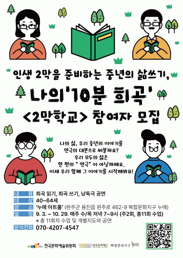 프로그램은 9월 3일부터 10월 29일까지, 매주 수요일,목요일 저녁 7시부터 9시까지 진행되며, 완주군 용진읍에 위치한 누에 아트홀에서 열린다. 총 23회 수업 (개별 지도포함) 으로 구성되며, 마지막 회차에는 참가자들이 직접 쓴 희곡을 바탕으로 낭독극 공연을 선보일 예정이다.