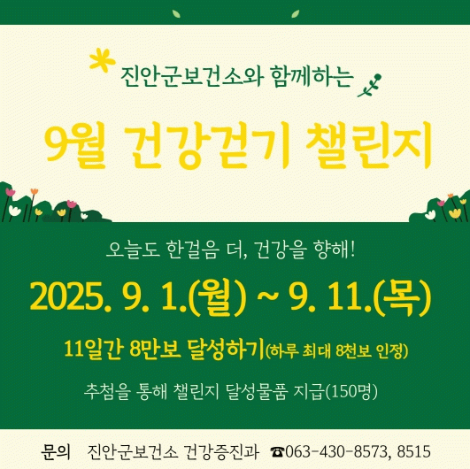 건강걷기 챌린지는 9월 시작으로 11월까지 월 1회 운영할 계획이며, 자세한 사항은 진안군보건소 건강증진팀에 문의하면 된다.