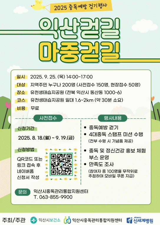 익산시는 중독관리통합지원센터와 함께 오는 9월 25일 유천생태습지공원 일대에서 '2025 중독 예방 걷기 행사 – 익산걷길, 마중걷길'을 개최한다고 22일 밝혔다.