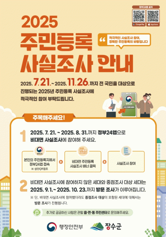 장수군은 참여 군민들의 편의를 높이고자 오는 31일 자정까지 비대면 조사를 먼저 진행한다. 비대면 조사는 대상자가 본인의 주민등록지에서 ‘정부24’앱에 접속한 후 사실조사 사항에 응답하는 방식으로 참여하면 된다.