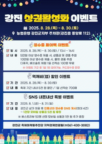이번 이벤트는 상가 방문객 및 소비 촉진을 유도해 강진읍 골목상권의 활력을 불어넣기 위해 진행되며, 주요 이벤트로는 강진사랑상품권 영수증 페이백 이벤트, 무료 체험 프로그램, 꽝 없는 돌림판 이벤트, ‘강진맛깨비’ 먹깨비 할인 이벤트, SNS 내돈내산 특별 이벤트 등이 있다.