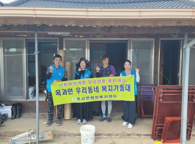 옥과면 우리동네 복지기동대는 1차로 노후된 전선을 교체하고 합선 우려 구간을 보강했으며, LED 조명 설치, 지붕 누수 부위를 중심으로 긴급 수리를 했으며, 주택이 많이 노후된 관계로 지붕을 다시 덮는 작업을 같이 진행했다.