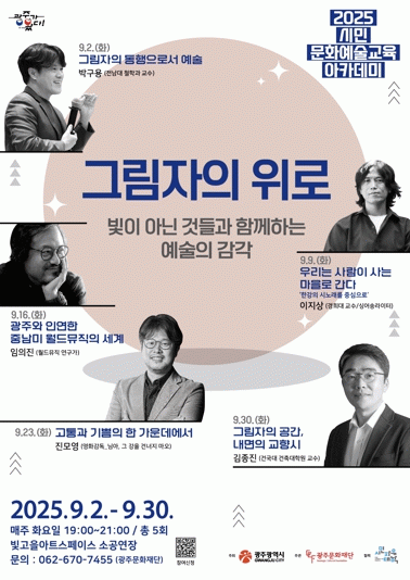 2024년부터 시작된 시민 대상 아카데미는 올해 ‘그림자의 위로–빛이 아닌 것들과 함께하는 예술의 감각’을 주제로 9월 한 달간 매주 화요일 총 5회에 걸쳐 진행된다. 이번 아카데미는 단순 강연을 넘어 공연과 대화를 결합한 ‘강연형 콘서트’ 형식으로 운영된다. 시민들이 예술적 경험을 통해 감수성과 창의적 사고를 확장할 수 있도록 기획됐으며, 광주문화재단과 (사)인문도시연구원 시민자유대학이 함께 협력해 추진된다.