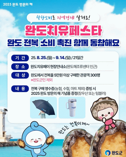 이벤트는 완도 전복을 5만 원 이상 구매한 관광객 300명(선착순)에게 ‘2025 완도 방문해’ 기념품(우산, 텀블러 중 한 가지)을 증정한다.