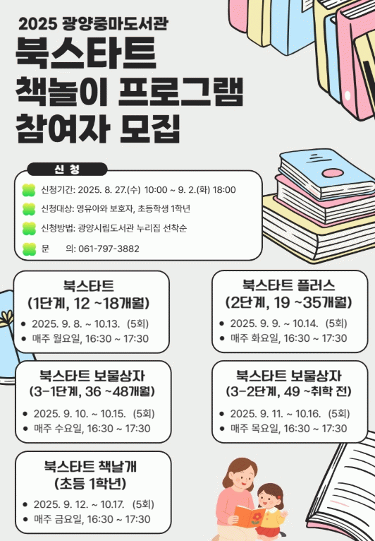 북스타트 책놀이 프로그램 수강 신청 및 기타 문의사항은 광양시립도서관 누리집을 확인하거나 중마도서관으로 문의하면 된다.