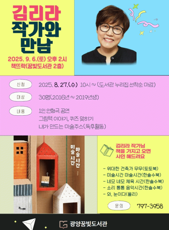 9월 6일 열리는 김리라 작가와의 1차 프로그램은 6세부터 초등학교 3학년까지 참여할 수 있으며, 참가 신청은 8월 27일부터 광양시립도서관 누리집을 통해 받는다.