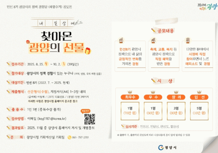 심사 결과는 11월 중 광양시청 누리집에 게시되며, 수상자에게 개별 통지된다.